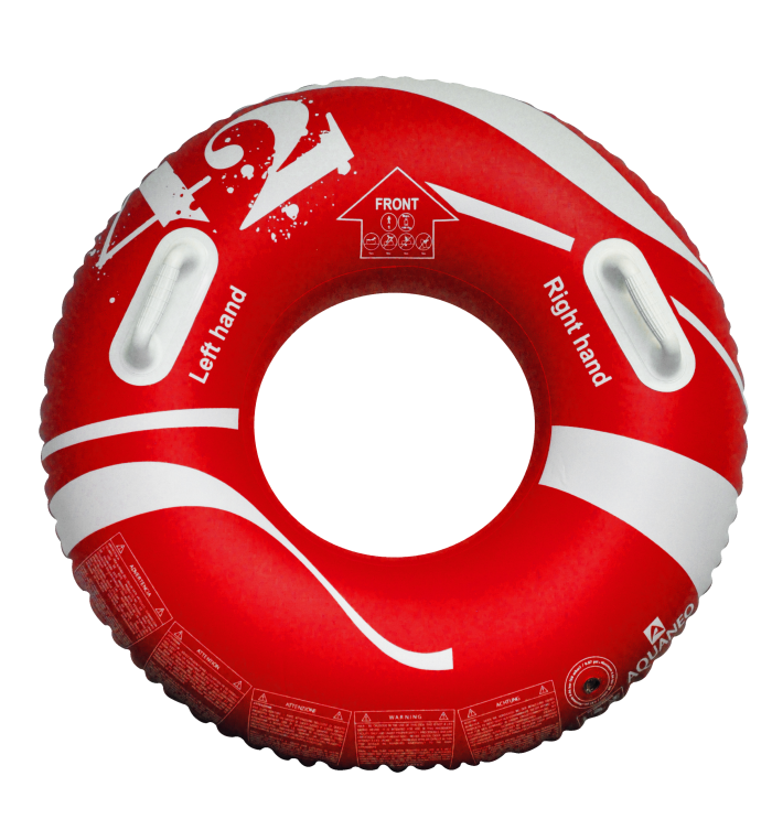Flotador circular simple para tobogan diámetro 96cm en PVC (diámetro interior 37cm). Cinturón central (altura 10cm). Construcción: termo soldadura solapada por aire caliente extra resistente. Concepción diseñada para un uso intensivo. 2 asas a las 10 horas y a las 2 horas. Color (PVC/impresión): rojo/blanco.