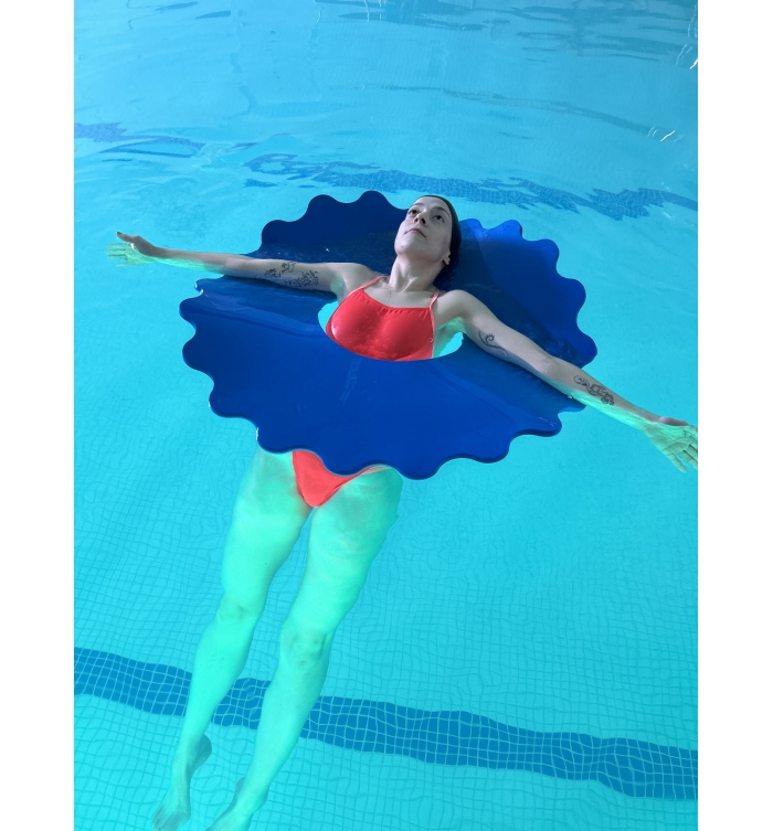 Piattaforma galleggiante circolare con un'apertura centrale, che ricorda la forma di una corolla di fiore, appositamente progettata per adattarsi alla forma della testa e del collo.Realizzata in schiuma di polietilene reticolato C020, offre una galleggiabilità ottimale e una maggiore durata.